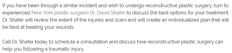 At Shafer Plastic Surgery in New York, Dr. David Shafer has helped hundreds of patients to regain their sense of self esteem after undergoing life-changing accidents that left behind scars and physical trauma. Incidents such as a car crash, slip and fall or even a physical attack...
