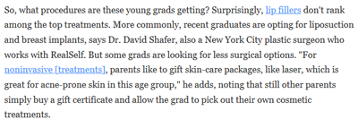So, what procedures are these young grads getting? Surprisingly, lip fillers don’t rank among the top treatments. More commonly, recent graduates are opting for liposuction and breast implants, says Dr. David Shafer, also a New York City plastic surgeon who works with RealSelf. But some grads are looking for less surgical options. “For noninvasive [treatments], parents like to gift skin-care packages, like laser, which is great for acne-prone skin in this age group,” he adds, noting that still other parents simply buy a gift certificate and allow the grad to pick out their own cosmetic treatments.