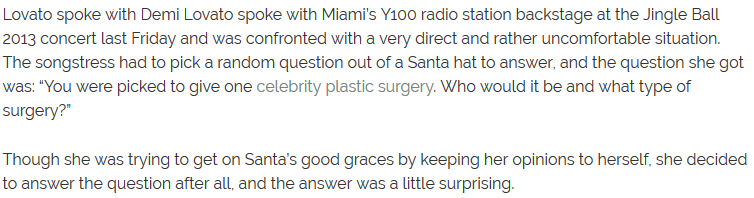 Lovato spoke with Demi Lovato spoke with Miami’s Y100 radio station backstage at the Jingle Ball 2013 concert last Friday and was confronted with a very direct and rather uncomfortable situation. The songstress had to pick a random question out of a Santa hat to answer, and the question she got was: “You were picked to give one celebrity plastic surgery. Who would it be and what type of surgery?”