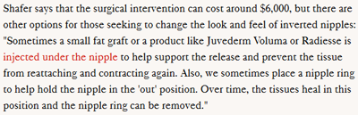 A Juvéderm® Voluma or Radiesse injection procedure can cost around $1,500, Shafer says, while getting a nipple ring can cost a few hundred dollars. As with any surgery, if you’re considering a nipple de-inversion procedure, make sure to find a board-certified surgeon you trust and discuss all your options.