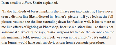“In the hundreds of breast implants that I have put into patients, I have never seen a distinct line like indicated in [Jenner’s] picture….If you look at the full picture, you can see the line extending down her flank as well. It looks more to me like effects of lighting or Photoshop, because a distinct line like that is not anatomical.” Typically, he says, plastic surgeons try to hide the incisions “in the inframammary fold, around the areola, or even in the armpit,” so it’s unlikely that Jenner would have such an obvious scar from a cosmetic procedure.