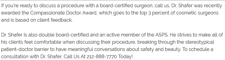 If you’re ready to discuss a procedure with a board-certified surgeon, call us. Dr. Shafer was recently awarded the Compassionate Doctor Award, which goes to the top 3 percent of cosmetic surgeons and is based on client feedback.