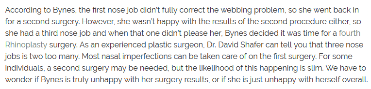 Bynes maintains she has been unhappy with her nose for quite some time and has felt self-conscious as a result. The surgeries have already reduced the size of her bridge and the initial surgery removed the webbing, so what more could she possibly ask for?