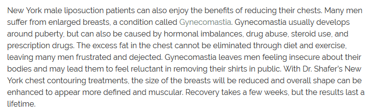New York male liposuction patients can also enjoy the benefits of reducing their chests. Many men suffer from enlarged breasts, a condition called Gynecomastia. Gynecomastia usually develops around puberty, but can also be caused by hormonal imbalances, drug abuse, steroid use, and prescription drugs. The excess fat in the chest cannot be eliminated through diet and exercise, leaving many men frustrated and dejected. Gynecomastia leaves men feeling insecure about their bodies and may lead them to feel reluctant in removing their shirts in public. With Dr. Shafer’s New York chest contouring treatments, the size of the breasts will be reduced and overall shape can be enhanced to appear more defined and muscular. Recovery takes a few weeks, but the results last a lifetime.