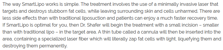 The way SmartLipo works is simple. The treatment involves the use of a minimally invasive laser that targets and destroys stubborn fat cells, while leaving surrounding skin and cells unharmed. There are less side effects than with traditional liposuction and patients can enjoy a much faster recovery time. If SmartLipo is optimal for you, then Dr. Shafer will begin the treatment with a small incision – smaller than with traditional lipo – in the target area. A thin tube called a cannula will then be inserted into the area, containing a specialized laser fiber which will literally zap fat cells with light, liquefying them and destroying them permanently.